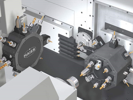 Komplexe Bearbeitungen in immer kürzeren Zeiten erfordern neue Maschinenkonzepte. Für Kostenreduzierung und Zeitersparnis beim Langdrehen sorgen wir mit unserer Baureihe Serie F. Vier unabhängige Schlitten stehen für die Bearbeitung bereit, somit verfügt die Serie F über ein echtes 4-Teile-System, welches komplexe Bearbeitungskombinationen sowie Komplettbearbeitung ermöglicht. Mit 15 Achsen und bis zu 38 Werkzeugen lässt die ML-F dem Anwender kaum mehr Wünsche offen. Zwei Werkzeugrevolver mit je 16 Werkzeugstationen wurden in das Konzept integriert. Der zweite Revolver ist an die Rückseite gekoppelt, somit stehen vier Werkzeuge gleichzeitig im Einsatz. Prozesse wie Gewindewirbeln, Schrägbohrungen von vorne, innengekühltes Tieflochbohren, Verzahnungs- und Gewindefräsen benötigen keine speziellen winkeleinstellbaren Werkzeuge mehr der Werkzeugrevolver macht's möglich!