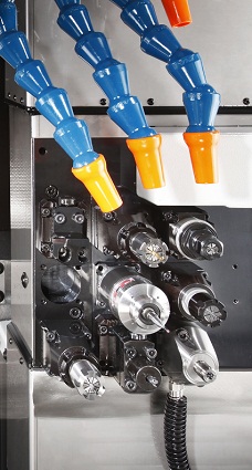 Mit der Option "Y2-Achse" haben Sie die Möglichkeit Ihre Rückseitenbearbeitung mit 9 Werkzeugen zu bestücken. Davon lassen sich 6 Werkzeuge antreiben, zusätzlich stehen Ihnen noch 3 feste Werkzeugstationen zur Verfügung. Die Antriebsleistung beträgt 0,5 kW (1,1 kW). Weiterhin besteht die Möglichkeit mit Hilfe der "Gewindewirbeleinrichtung Y2-Achse" auch auf der Rückseite jegliche Arten von Gewinden in der Nebenzeit zu wirbeln.